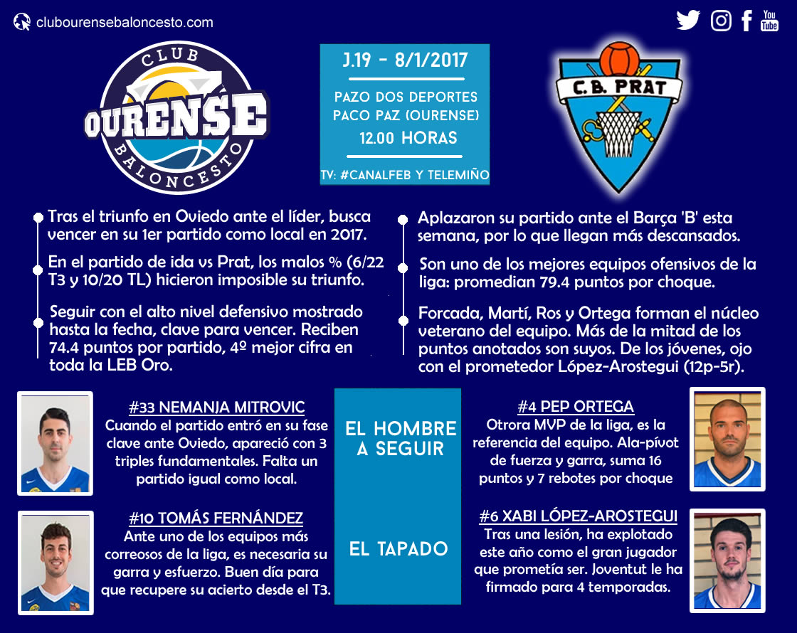 Con siete triunfos y diez derrotas llegará el CB Prat al partido que disputará este domingo a las 12.00 de la mañana ante el Ourense Provincia Termal en el Pazo Paco Paz. Será un partido complicado ante un conjunto catalán que ya logró el triunfo en el partido de ida allá por septiembre, donde el COB perdió por 84-72. Fue un inicio ideal del CB Prat, que sumó tres victorias seguidas antes de entrar en una racha negativa que se extendió durante seis jornadas. Ahora, han recuperado efectivos y con todos sanos han vencido en tres de los cuatro últimos partidos, incluyendo un gran triunfo ante Leyma Coruña por 90-97 o en la última jornada ante Araberri por 106-100.