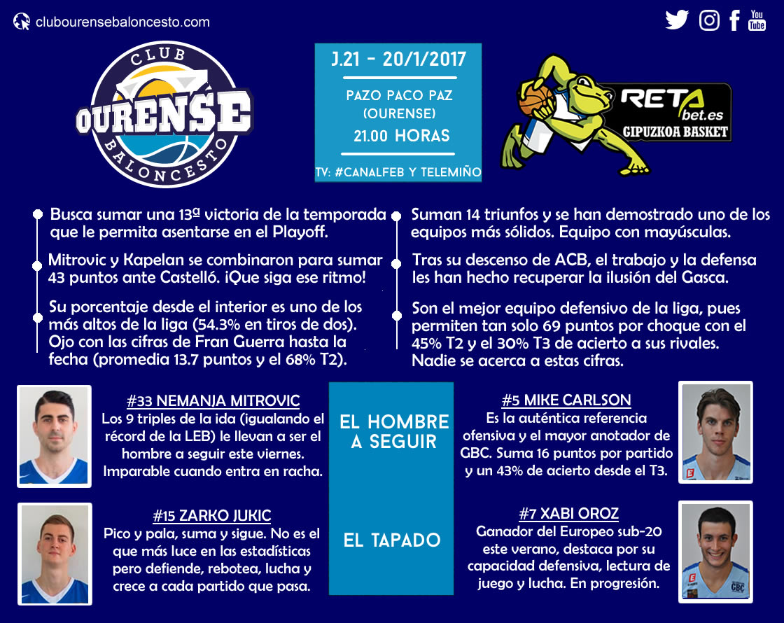 Hasta la fecha, Melilla, Breogán, Palencia o Burgos han sido algunos de los que equipos que han caído ya ante la consistencia de RETAbet.es GBC. El conjunto vasco ha logrado importantes victorias esta temporada, y de hecho, en casa, solo nuestro Ourense Provincia Termal ha conseguido vencerles. En su éxito, la defensa es la clave: reciben 69 puntos por partido (el que menos en la liga), 0.95 puntos por posesión (con diferencia el mejor en la competición) y bajan los porcentajes de lanzamiento de sus rivales a cifras que ningún otro equipo se acerca (permiten tan solo un 45% de acierto en tiros de dos y un 30% en triples). Cierran su aro e impiden rebotes de ataque. No son tan intensos como otros, pero molestan los lanzamientos y son los más eficaces.