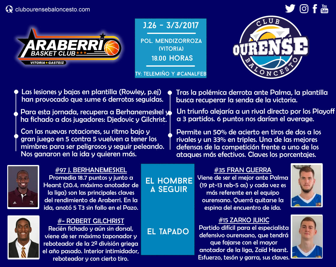 Con doce triunfos y trece derrotas se presentará el Sáenz Horeca Araberri al partido que desde las 18.00 horas de este sábado le enfrentará en el Polideportivo de Mendizorroza al Ourense Provincia Termal (en directo, en Telemiño y #CanalFEB). Con la salvación virtualmente conseguida, el premio de equipo revelación se queda corto para un equipo que ha conseguido vencer en Lugo, en Palencia, en Ourense o en casa a Melilla y al líder RETAbet.es GBC. Pese a estos resultados, las lesiones (Berhanemeskel) y bajas sufridas en las últimas semanas (se han ido Akingbala, Rowley, Durchev y Hadziomerovic) han provocado que el equipo, en cuadro, haya entrado en una minicrisis de seis derrotas, si bien en todo hay algo positivo: con el equipo en cuadro, han conseguido competir ante todos sus rivales, cayendo en los minutos finales ante Coruña, Palma o el nuevo Barcelona “B”. Esta semana, Berhanemeskel se ha recuperado y han incorporado a dos jugadores, Nedim Djedovic y Robert Gilchrist. Con ellos, sin duda alguna, Araberri volverá a ser peligroso. Volverá a ser la revelación. Ya perdieron a Doblas y Papantoniou y siguieron compitiendo. La acumulación de bajas les hizo algo más débiles, pero vuelven a ser peligrosos, y tener claro esto será fundamental para que el Ourense Provincia Termal pueda hacerse con el partido.