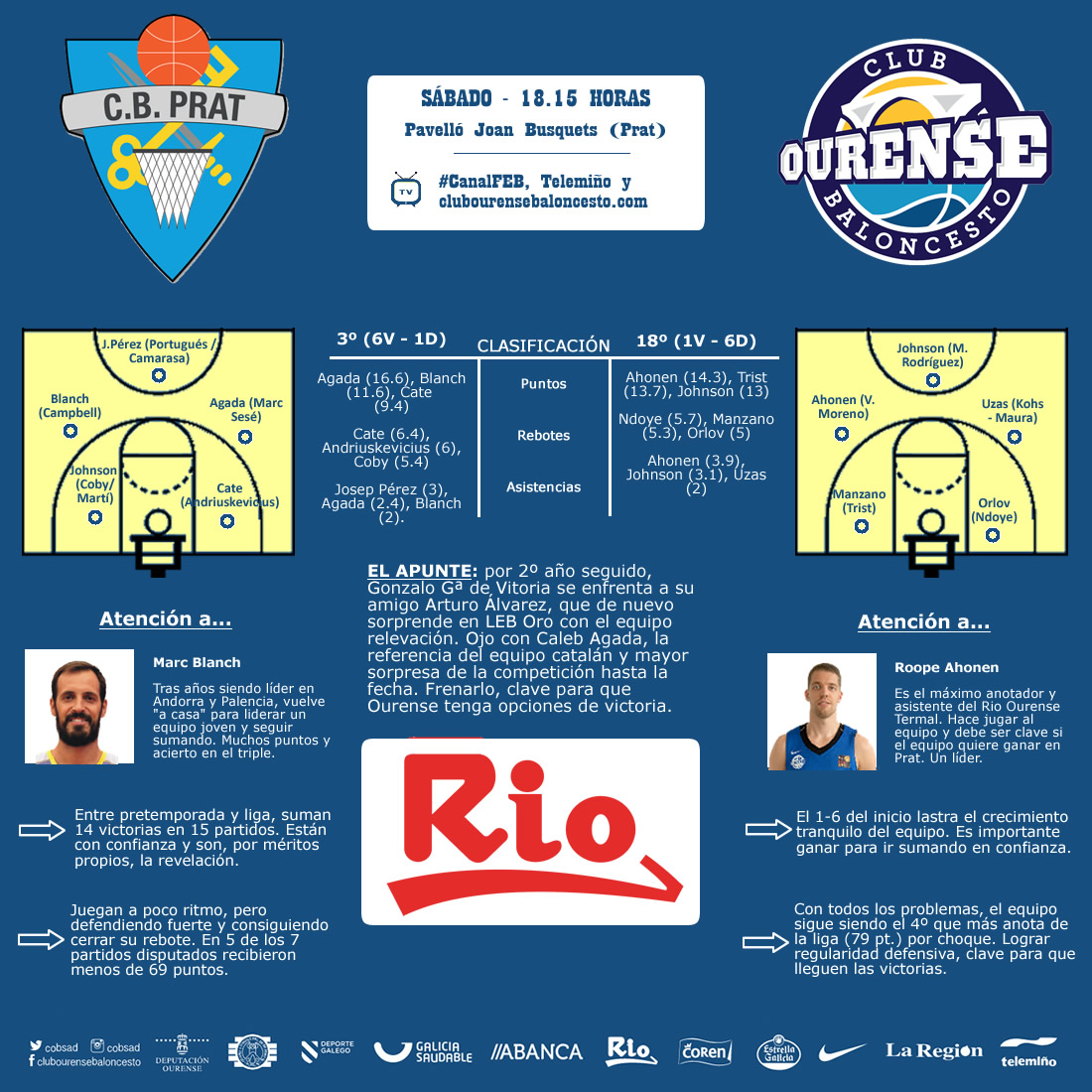 Al partido ambos equipos se presentarán previsiblemente sin bajas, en un encuentro que medirá sensaciones pero también estilos contrapuestos. De este modo, el victorioso y confiante Prat recibirá al ansioso y trabajador Rio Ourense Termal, en un partido que enfrentará a una de las mejores defensas (Prat) con uno de los mejores ataques (Ourense).
