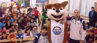 Los jugadores Raúl Mena y Javi Múgica, acompañados por la mascota del equipo “El Lobo”, regalaron entradas, pósters y firmaron autógrafos a tod@s l@ niñ@s del Colegio Vistahermosa.